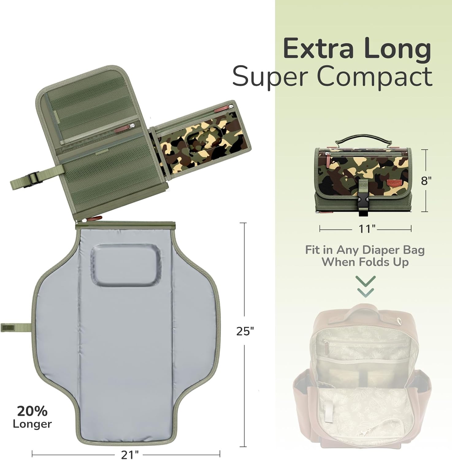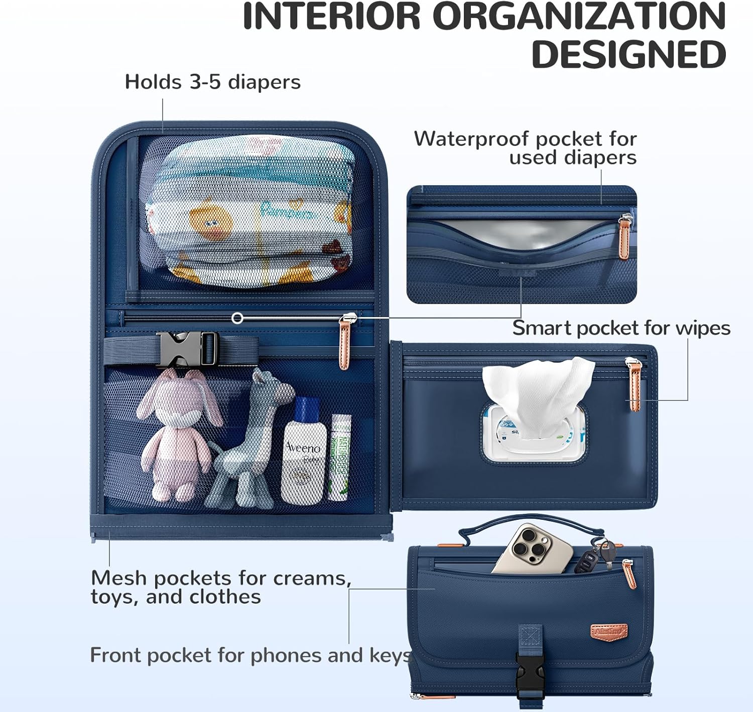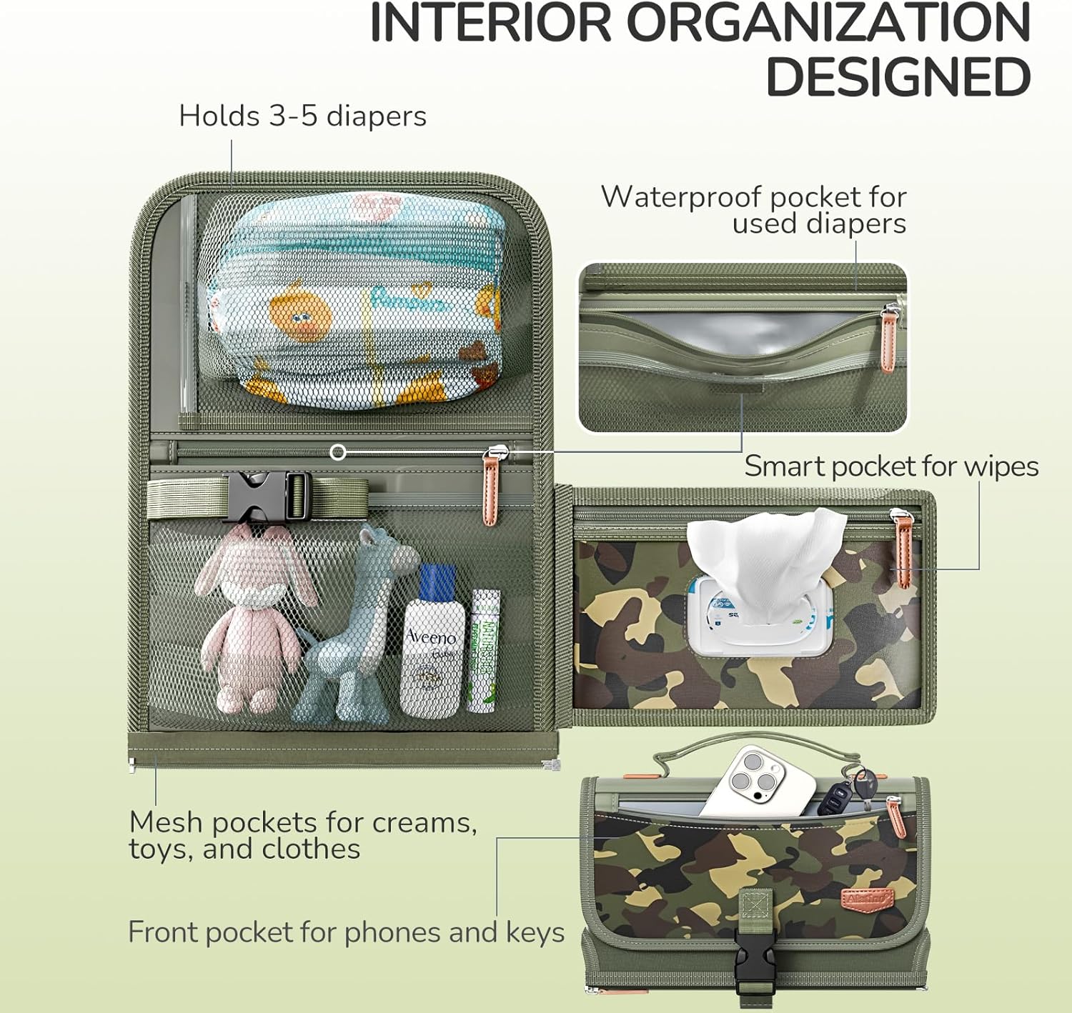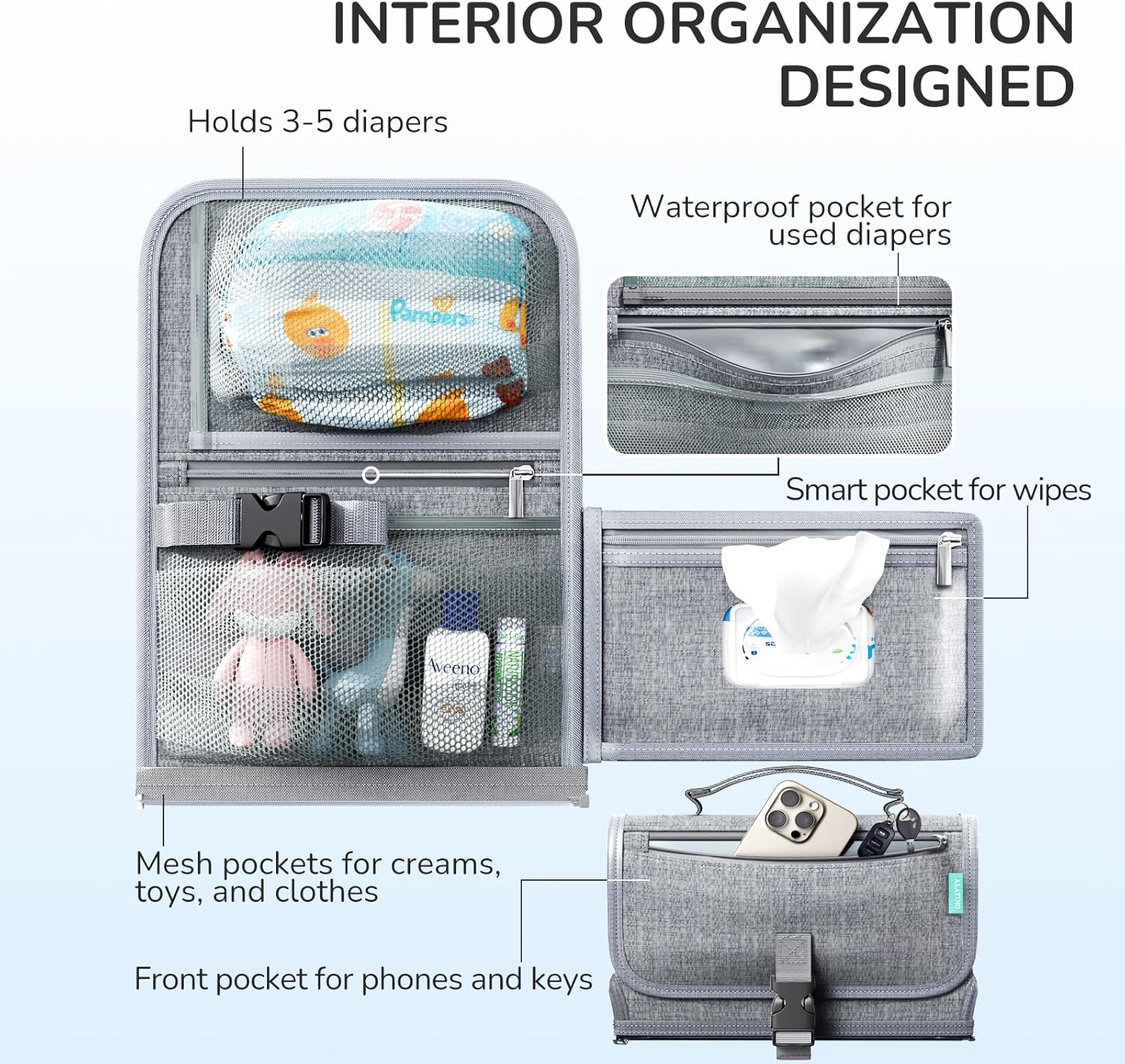 ✔ Slimme opbergruimte – vakken voor luiers, doekjes, crème, kleertjes en een extra ritsvakje voor telefoon en sleutels